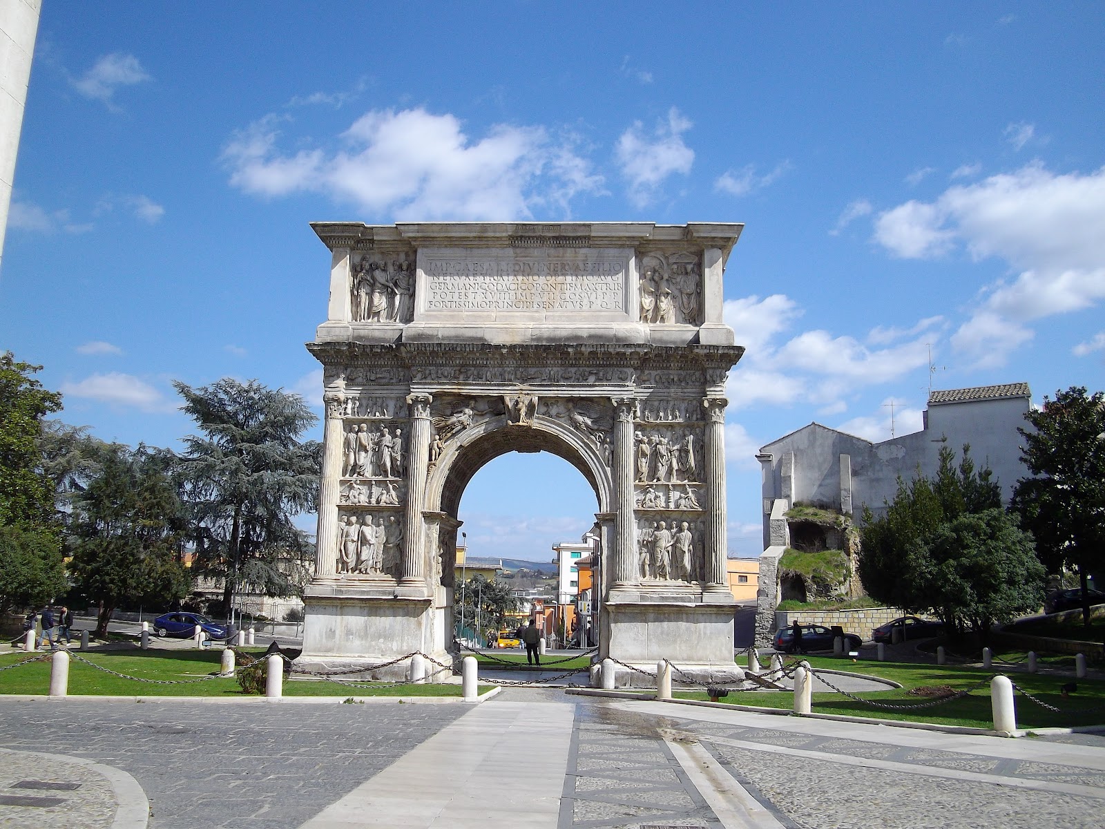 Simbolo delle città è indubbiamente l’Arco di Traiano, alto 15 metri e sopravvissuto integro al passare del tempo, mantendo ancora ben visibili le decorazioni scultoree che celebrano le imprese dell’Imperatore Traiano.